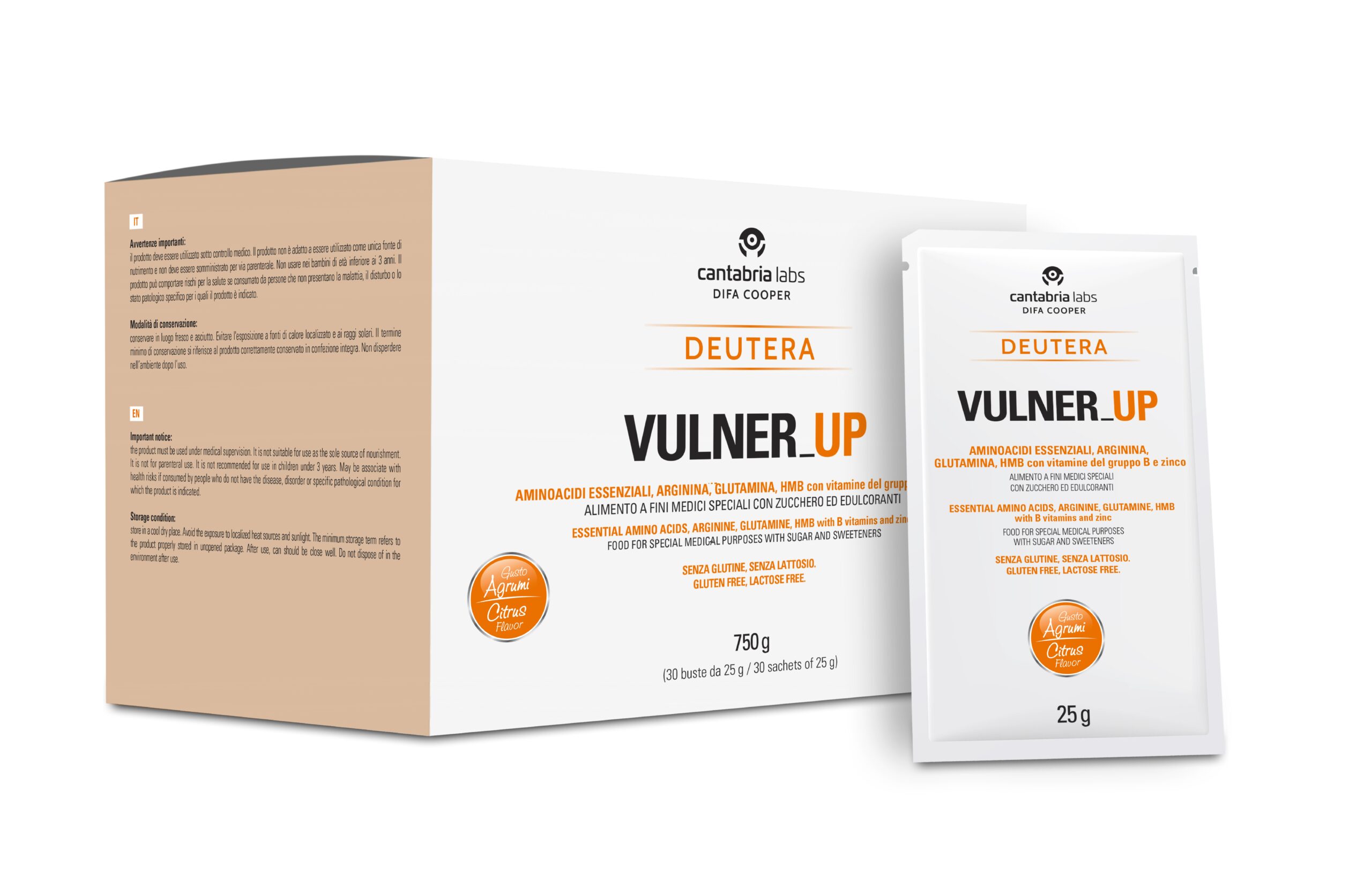 VULNER_UP è un alimento a fini medici speciali a base di aminoacidi essenziali, arginina, glutamina, HMB, con tiamina e vitamina B6, indicato per la gestione dietetica di pazienti con malnutrizione proteica per favorire il ripristino della massa muscolare e la ricostruzione dei tessuti danneggiati.